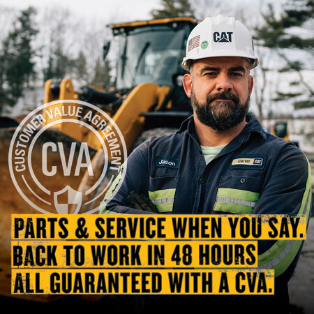 *Maintenance, wear, and repair parts guaranteed as soon as the end of the next business day or customer receives Cat Credits for the value of the part, up to $1,000. Applicable for parts not already covered by warranty or EPP. For a complete list of included parts, talk to your Product Support Representative. **Service response time is guaranteed for CVAs with labor only on the day customer requests service or customer receives Cat Credits for the value of $500. Service must be requested through Cat Central or VisionLink to apply. Not valid for routine maintenance which should be scheduled in advance. Applicable for remote, shop, and field service as available at discretion of Carter Machinery. ***Back to Work commitment is provided by 48 hours of approved quote or by the agreed service completion date. Customers receive $1,000 in Cat Credits for repairs not completed by 48 hours or by the agreed service completion date.