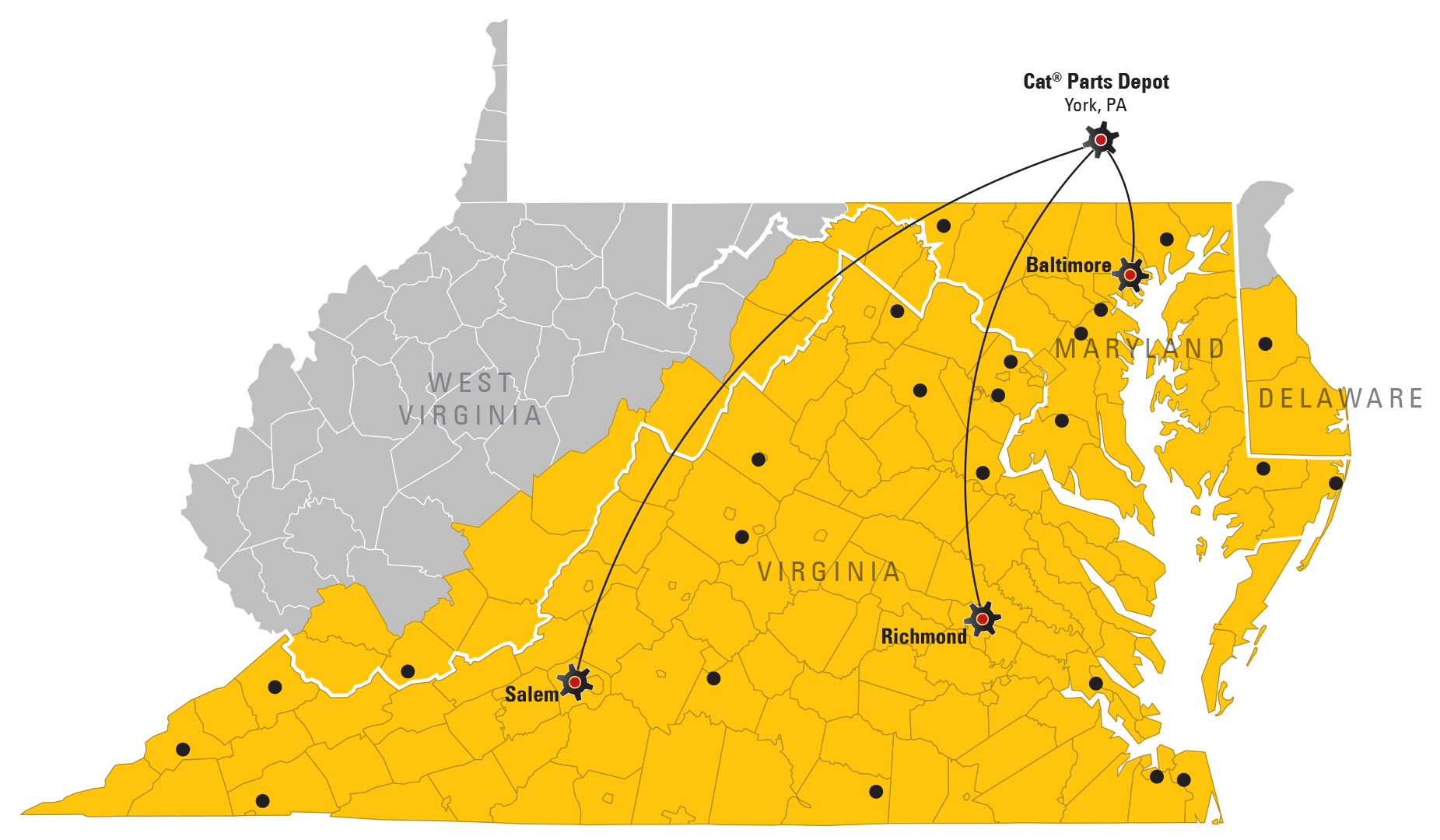 Our triple hub system, outlined below, is the key to ensuring parts availability to our customers. Every night, our stores are serviced by local truck runs that originate from our hubs in Baltimore, Richmond, and Salem. In turn, our hubs are supplied by daily truck runs from the regional Cat Parts Depot in York, PA. As a result, most parts are available on the shelf or next day.