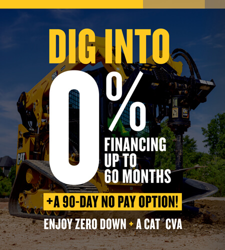 For a limited time only take advantage of finance rates as low as 0% and zero down payment on qualifying machines. Plus, you’ll receive a Cat Customer Value Agreement (CVA) with your purchase.